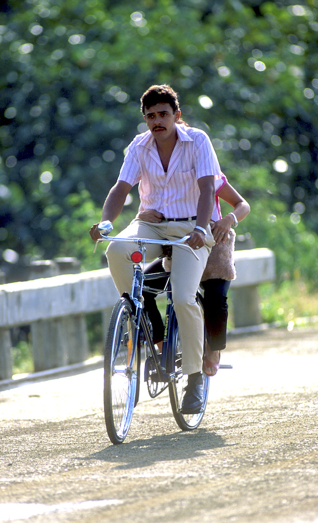 Sri Lanka, Polonnaruwa, embalse, joven con bicicleta