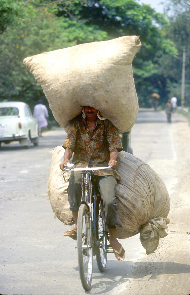 India, Mysore, Fiesta de Dussehra, Karnataka, ciclista, sobrecargada
