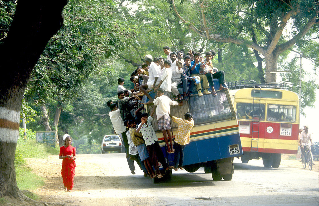 India, Mysore, Fiesta de Dussehra, Karnataka, Bus de linea sobrecargada